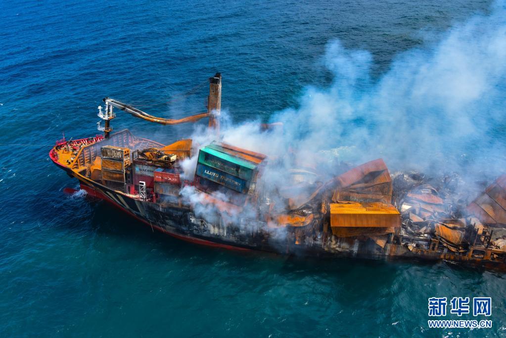這是6月2日在斯里蘭卡科倫坡港附近拍攝的逐漸下沉的起火貨船“X-PRESS PEARL”號(hào)。