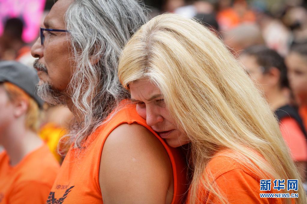當(dāng)天是加拿大日,上千名抗議者在溫哥華集會,悼念加拿大在強(qiáng)制“同化”原住民過程中遭到殘害的兒童,呼吁取消加拿大日的慶?;顒?dòng)。