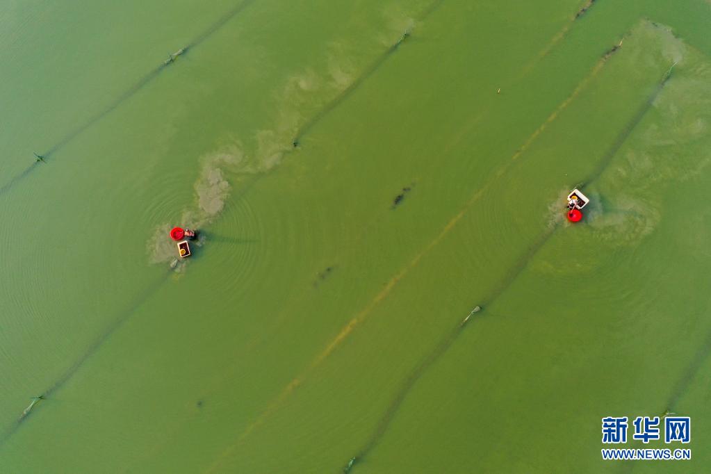 7月5日,在湖南省永州市道縣蚣?jí)捂?zhèn)洲背村,村民在收獲小龍蝦(無(wú)人機(jī)照片)。