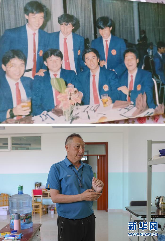 這是一張拼版照片:上圖為20世紀80年代杜寶柱(后排中)參加國際比賽時和隊員們的合影(受訪者供圖);下圖為杜寶柱教練在塔城市第二小學宿舍內(nèi)整理裝備,準備出門帶隊訓練(6月12日攝,新華社記者 胡虎虎 攝)。