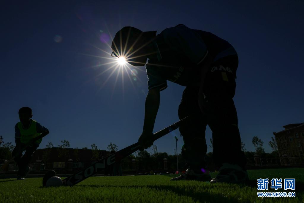 塔城市第二小學曲棍球隊的小隊員們在訓練中(6月13日攝)。