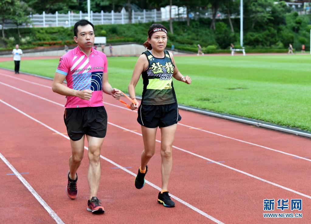 猛龍長跑隊視聽障跑手蔡浩良(左)與隊友一起練跑(7月29日攝)。新華社記者 盧炳輝 攝
