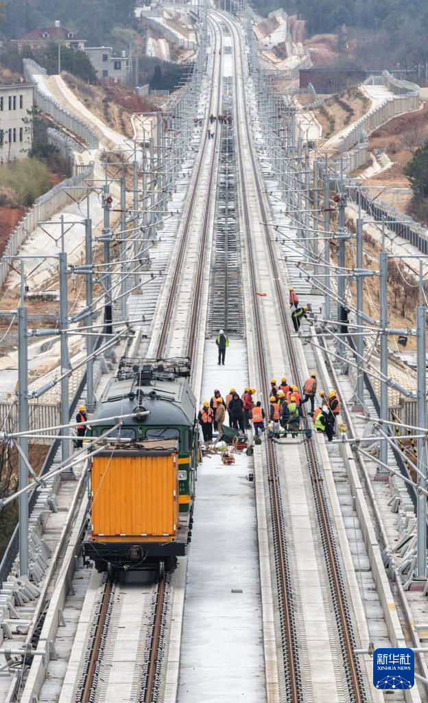 1月19日拍摄的昌九高铁庐山南站至共青城东站区段铺轨施工现场。