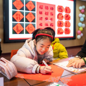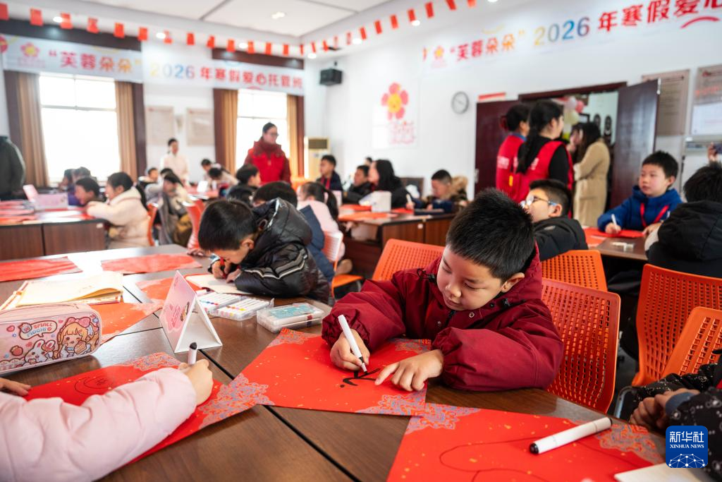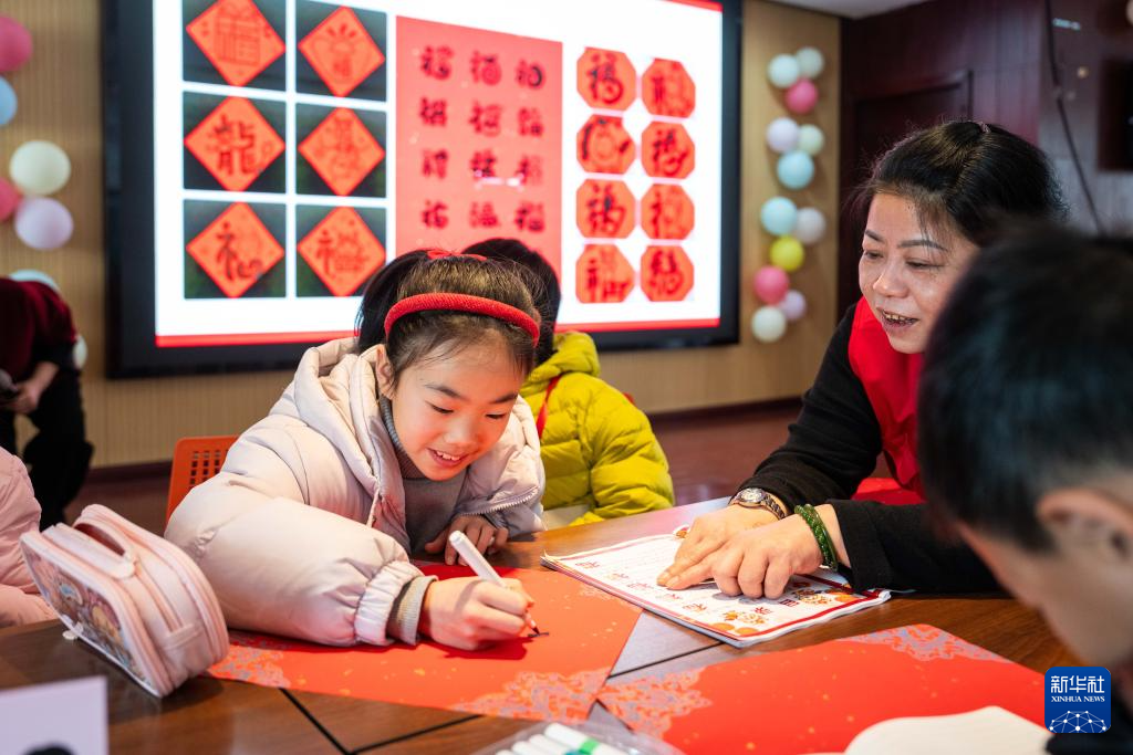 2月1日,在芙蓉区识字里社区服务中心,学生们在课堂上写福字。