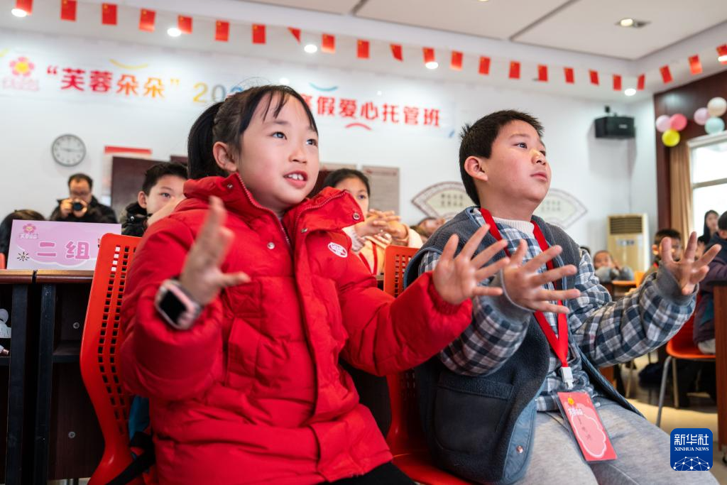 2月1日,在芙蓉区识字里社区服务中心,学生们在课堂上进行热身运动。