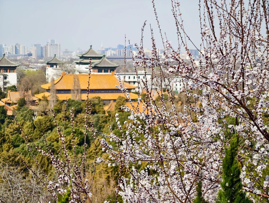 春分将至,景山公园春花绽放。古建与繁花相映成趣,吸引众多游客赏花留影。