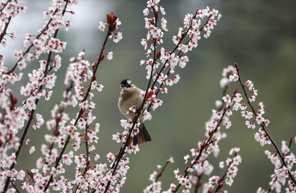 3月16日,小鸟在贵州省铜仁市玉屏侗族自治县皂角坪街道茅坪村的花间觅食。