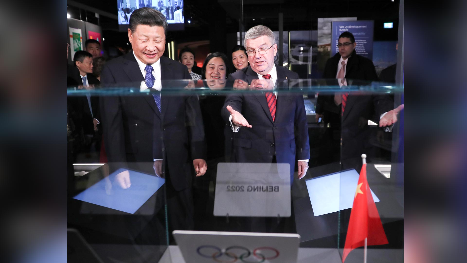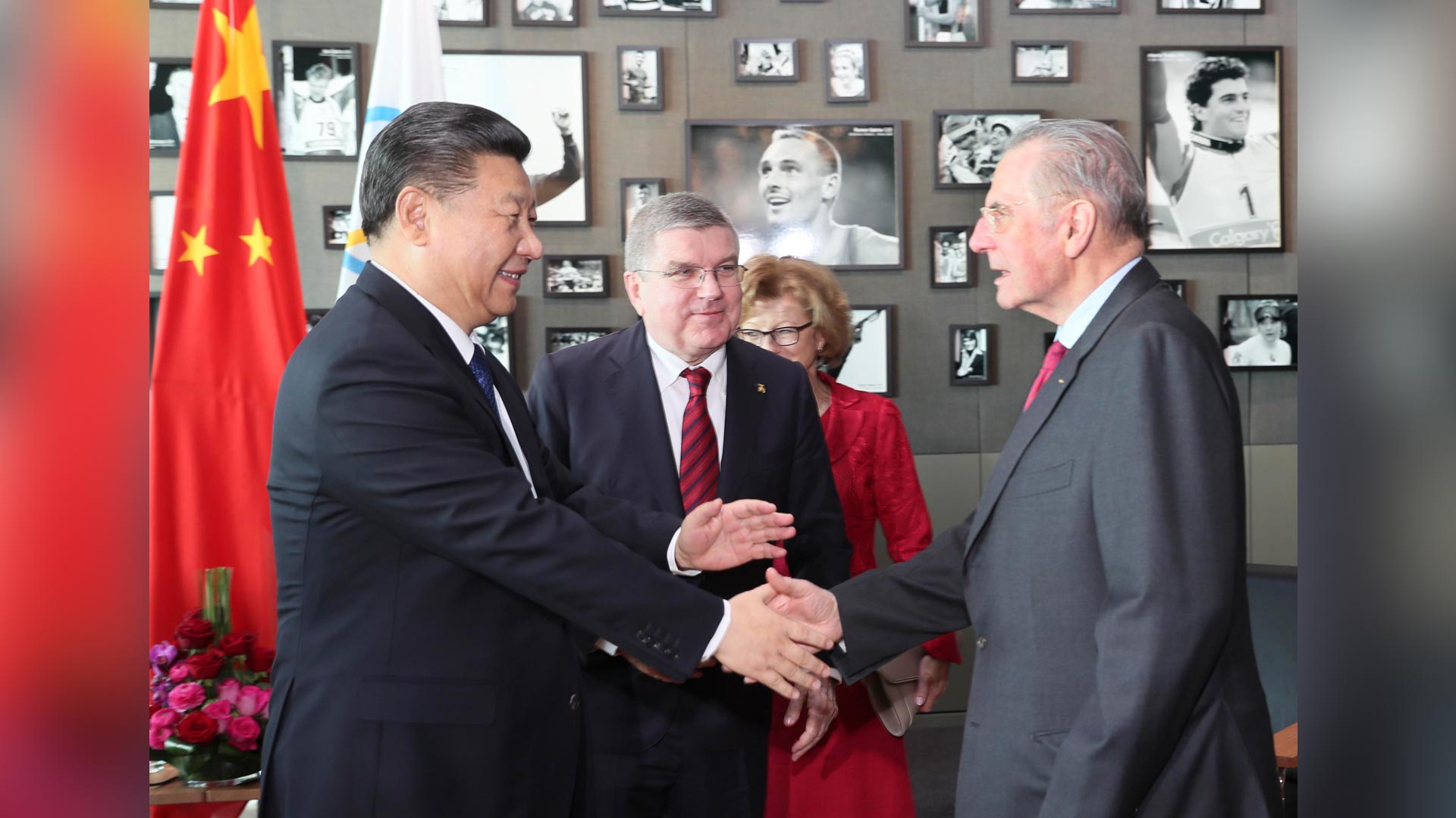1月18日,國(guó)家主席習(xí)近平在瑞士洛桑國(guó)際奧林匹克博物館會(huì)見國(guó)際奧林匹克委員會(huì)主席巴赫。這是習(xí)近平和夫人彭麗媛與巴赫夫婦及部分國(guó)際奧委會(huì)中國(guó)委員在國(guó)際奧委會(huì)會(huì)旗前合影。新華社記者 蘭紅光 攝2017-01-19