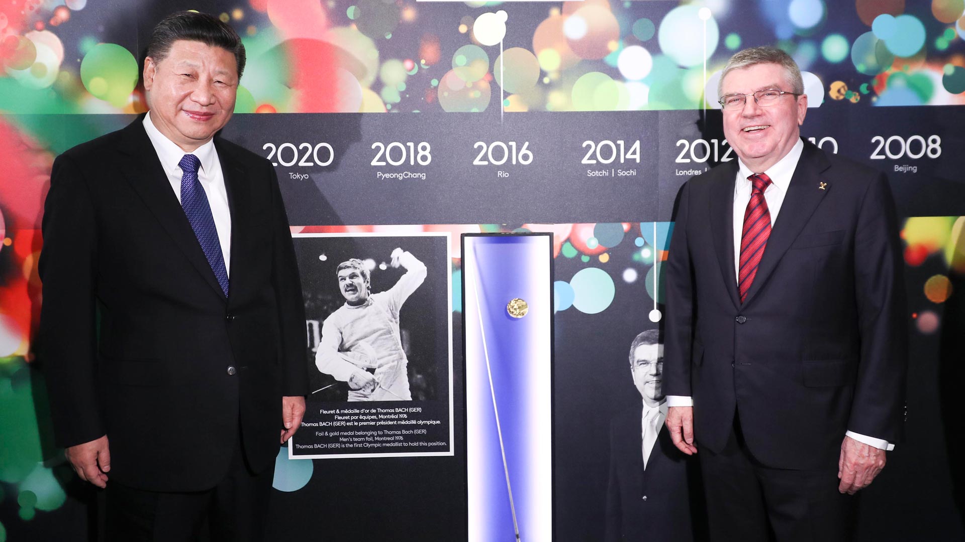 1月18日,國(guó)家主席習(xí)近平在瑞士洛桑國(guó)際奧林匹克博物館會(huì)見國(guó)際奧林匹克委員會(huì)主席巴赫。這是習(xí)近平與巴赫在巴赫作為擊劍運(yùn)動(dòng)員參加奧運(yùn)會(huì)的照片前合影。新華社記者 蘭紅光 攝2017-01-19