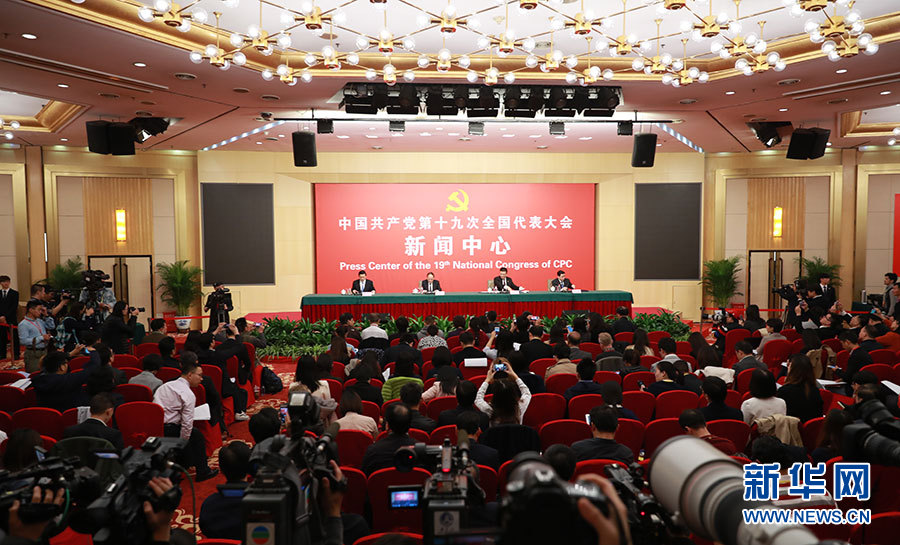 10月21日,十九大新聞中心舉辦記者招待會,邀請中共中央統(tǒng)戰(zhàn)部常務副部長張裔炯、副部長冉萬祥,中共中央對外聯(lián)絡部副部長郭業(yè)洲介紹黨的統(tǒng)一戰(zhàn)線工作和黨的對外交往情況,并回答記者提問。圖為記者招待會現(xiàn)場。新華網(wǎng) 郝廣鵬攝