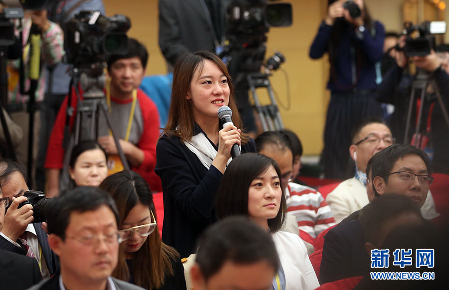 10月21日,十九大新聞中心舉辦記者招待會,邀請中共中央統(tǒng)戰(zhàn)部常務(wù)副部長張裔炯、副部長冉萬祥,中共中央對外聯(lián)絡(luò)部副部長郭業(yè)洲介紹黨的統(tǒng)一戰(zhàn)線工作和黨的對外交往情況,并回答記者提問。圖為經(jīng)濟日報記者提問。新華網(wǎng) 郝廣鵬攝