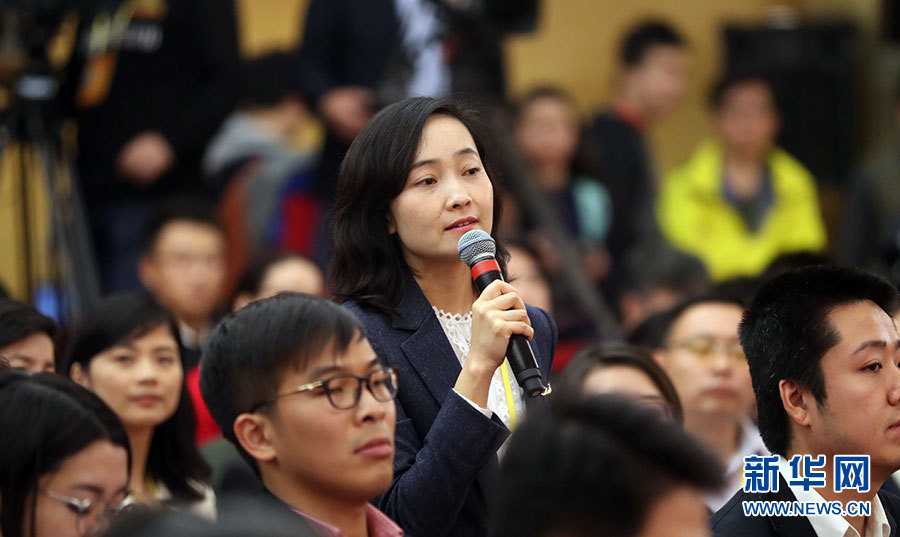 ??? 10月21日,十九大新聞中心舉辦記者招待會(huì),邀請(qǐng)中共中央統(tǒng)戰(zhàn)部常務(wù)副部長(zhǎng)張裔炯、副部長(zhǎng)冉萬(wàn)祥,中共中央對(duì)外聯(lián)絡(luò)部副部長(zhǎng)郭業(yè)洲介紹黨的統(tǒng)一戰(zhàn)線工作和黨的對(duì)外交往情況,并回答記者提問(wèn)。圖為新華社記者提問(wèn)。新華網(wǎng) 郝廣鵬攝