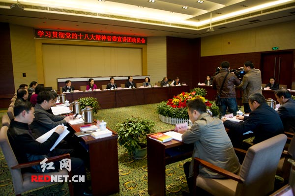 11月28日,黨的十八大精神湖南省委宣講團(tuán)正式成立,12月5日起至2013年元月底,宣講團(tuán)將赴長沙、各市州、省直單位、高等院校和大型企業(yè)開講,并將在紅網(wǎng)等網(wǎng)站開展網(wǎng)上視頻宣講。湖南省委常委、省委宣傳部部長許又聲出席動(dòng)員會(huì)并講話。
