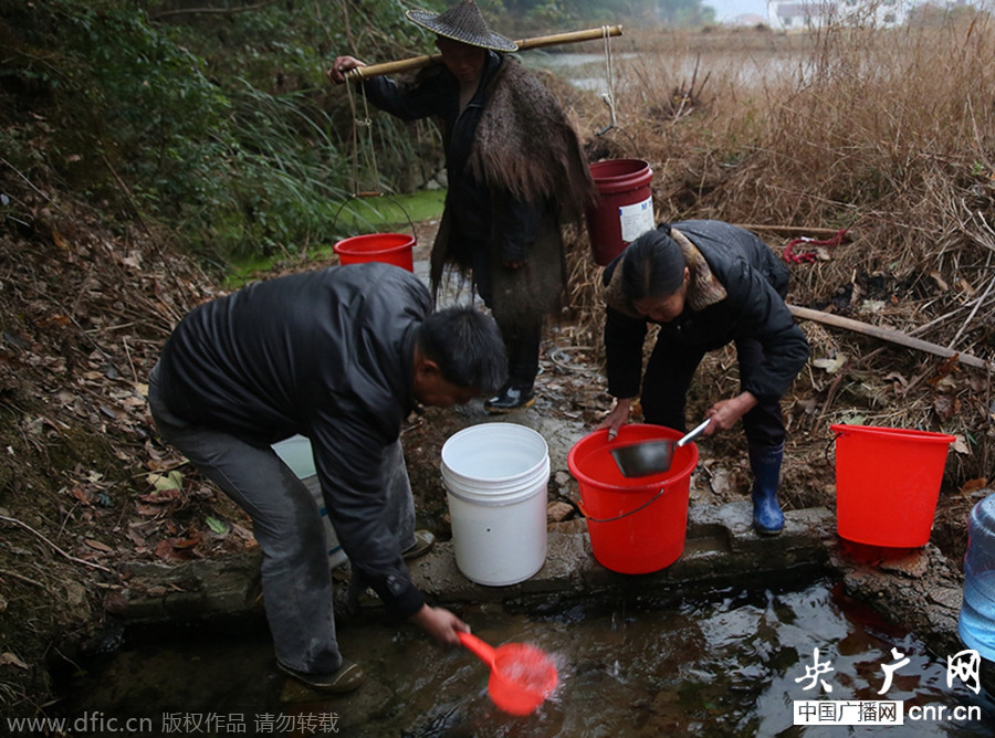 2014年12月9日報道,由于飲用水水庫緊挨著露天垃圾填埋場,生怕水質不佳而影響自己的身體健康,義烏市佛堂鎮(zhèn)陳村的不少村民們再也不敢從村頭的團結水庫取水飲用了,眼下590多名村民為了飲水安全問題而糾結不堪。陳村的村民冒雨前往村外一處的泉眼取水。 圖片署名:浙報集團-東方IC