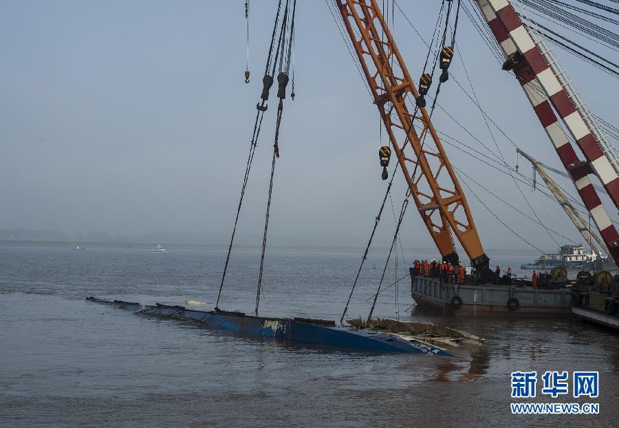 新華網(wǎng)湖北監(jiān)利6月5日電(記者皮曙初、王賢)記者在“東方之星”沉船施救現(xiàn)場看到,7時40分,“東方之星”船體已側(cè)翻過來,露出“東方之星”四個大字,藍色的船體也已露出水面。
