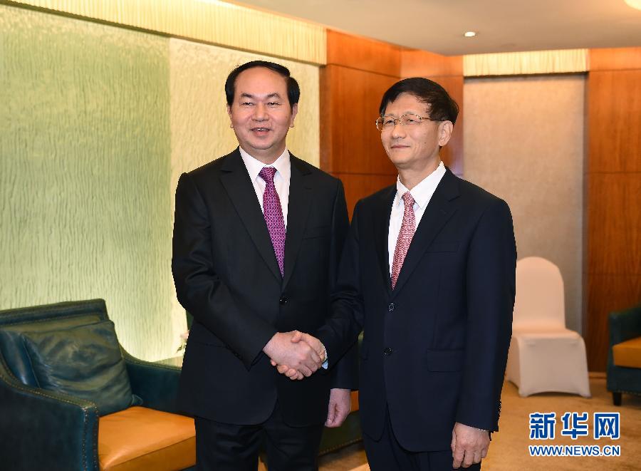 ??? 10月23日,中共中央政治局委員、中央政法委書(shū)記孟建柱在北京會(huì)見(jiàn)出席“安全促發(fā)展”中國(guó)東盟執(zhí)法安全合作部長(zhǎng)級(jí)會(huì)議的越共中央政治局委員、公安部部長(zhǎng)陳大光。新華社記者張領(lǐng)攝