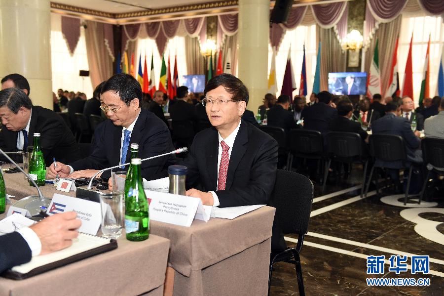 ??? 5月24日,在俄羅斯車臣共和國(guó)首府格羅茲尼,中共中央政治局委員、中央政法委書(shū)記孟建柱(前右一)在第七屆安全事務(wù)高級(jí)代表國(guó)際會(huì)議上發(fā)言。中共中央政治局委員、中央政法委書(shū)記孟建柱24日在俄羅斯車臣出席第七屆安全事務(wù)高級(jí)代表國(guó)際會(huì)議。來(lái)自70余個(gè)國(guó)家和國(guó)際組織的代表就深化國(guó)際安全合作、有效應(yīng)對(duì)恐怖主義等問(wèn)題進(jìn)行探討。新華社發(fā)(郝帆攝)