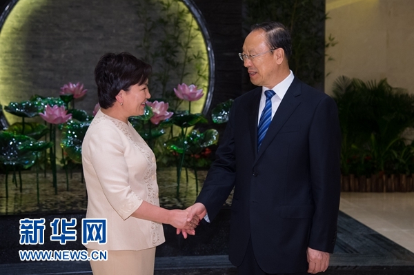 6月7日,中共中央書(shū)記處書(shū)記、全國(guó)政協(xié)副主席杜青林在澳門會(huì)見(jiàn)來(lái)華出席太湖世界文化論壇第四屆年會(huì)的吉爾吉斯斯坦副總理庫(kù)代別爾季耶娃。新華社記者 張金加 攝