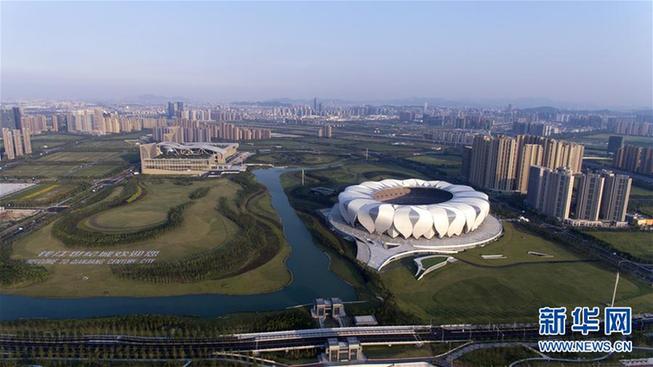 俯瞰浙江杭州奧體中心主體育場(chǎng)和杭州國(guó)際博覽中心(2016年8月25日攝)。新華社記者 鞠煥宗 攝