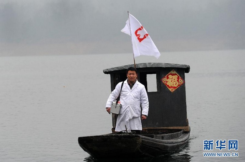 海島的東島岸邊,常年??恐粋€船屋,外面掛著“麻埠鎮(zhèn)齊山村海島衛(wèi)生站”的牌子。39歲的余家軍是船屋的主人,1999年衛(wèi)校畢業(yè)后回到齊山村,和妻子吳起嬌把家安到了船上,取名“海島衛(wèi)生站”,他也成了這里唯一的村醫(yī)。18年里,不論是白天黑夜、刮風(fēng)下雨甚至下雪,余家軍都劃著一條小木船,每日來往于東西兩島之間,為200多名村民看病,這條木船也被村民們親切地稱為“水上120”。