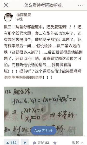 昨天上午,多名網(wǎng)友發(fā)微博爆料稱,2018年全國(guó)碩士研究生統(tǒng)一招生考試數(shù)學(xué)科目出現(xiàn)“神押題”,一位名為“李林”的教師在考前押題視頻中舉的例題與實(shí)際考研的考試試題十分相似。網(wǎng)友指出,李林押題“命中率”高達(dá)80%,甚至連超綱的二階差分都反復(fù)強(qiáng)調(diào)?!懊磕暄褐袔讉€(gè)題已經(jīng)很牛了,這位老師押中線代大題原題、證明題原題也就罷了,連超綱的二階微分都猜中,并且反復(fù)強(qiáng)調(diào)?!?/p>