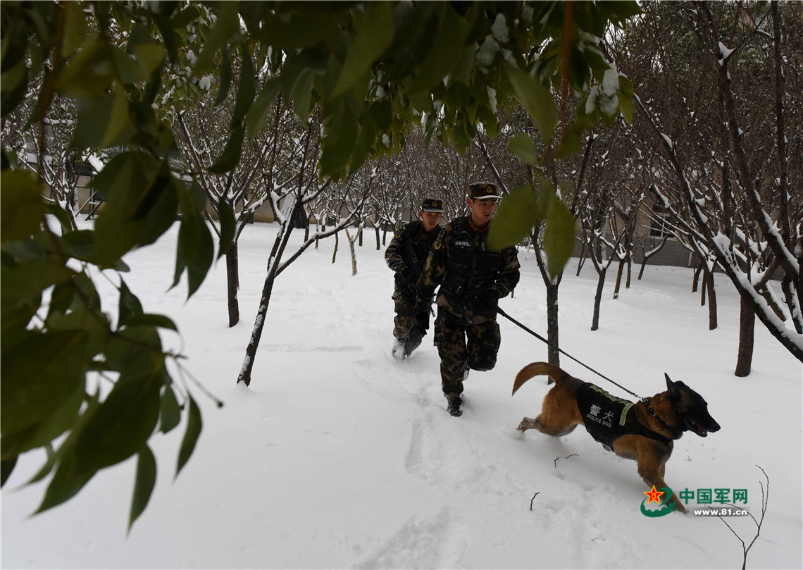 1月27日,武警安徽總隊機動支隊警犬班班長王營廣(前)帶領(lǐng)警犬“魯克”進行武裝追捕訓練。