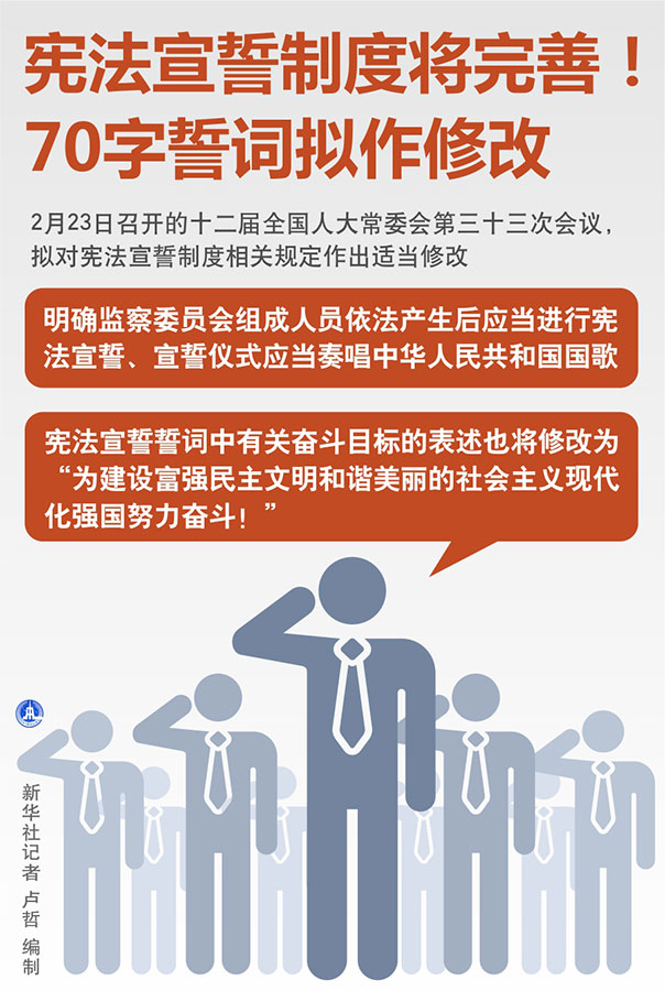 新華社北京2月23日電(記者陳菲、王琦)23日召開(kāi)的十二屆全國(guó)人大常委會(huì)第三十三次會(huì)議,擬對(duì)憲法宣誓制度相關(guān)規(guī)定作出適當(dāng)修改,明確監(jiān)察委員會(huì)組成人員依法產(chǎn)生后應(yīng)當(dāng)進(jìn)行憲法宣誓、宣誓儀式應(yīng)當(dāng)奏唱中華人民共和國(guó)國(guó)歌。憲法宣誓誓詞中有關(guān)奮斗目標(biāo)的表述也將修改為“為建設(shè)富強(qiáng)民主文明和諧美麗的社會(huì)主義現(xiàn)代化強(qiáng)國(guó)努力奮斗!”