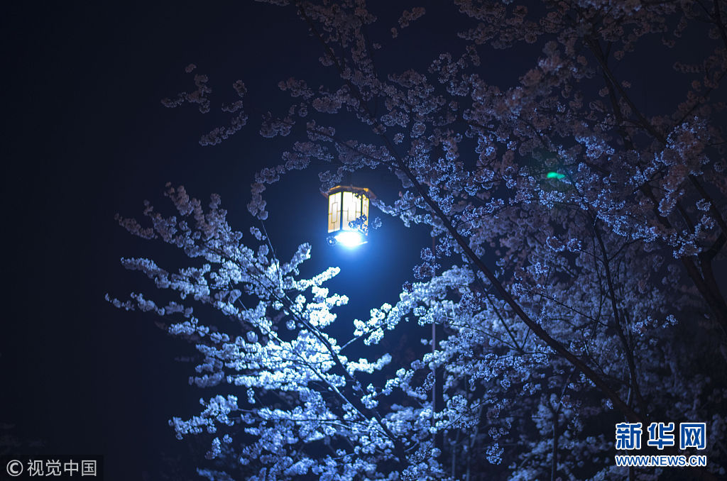 3月25日,揚(yáng)州鑒真大道,夜幕下的櫻花,在燈光月色的輝映下別有一番意境。(圖片來源:視覺中國)