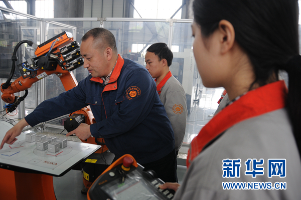 胡明華在機(jī)器人應(yīng)用工程實(shí)驗(yàn)室里指導(dǎo)學(xué)生們進(jìn)行機(jī)器人操作學(xué)習(xí)。新華網(wǎng) 聶晨靜 攝