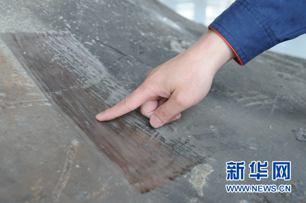 胡明華為記者展示用自動編程自適應(yīng)機(jī)器人自動打磨系統(tǒng)打磨的鑄鍛件表面部分。新華網(wǎng) 聶晨靜 攝