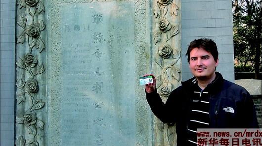 清華大學(xué)留學(xué)生西泰拿出帶有自己名字的學(xué)生證與利瑪竇墓碑合影。