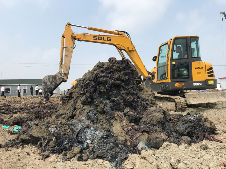 6月15日,也即中央第四環(huán)保督察組下沉泰州市當(dāng)日,督察人員便調(diào)來挖掘機(jī),對(duì)群眾舉報(bào)區(qū)域隨機(jī)選點(diǎn)進(jìn)行試探性挖掘。讓人沒有想到的是,僅僅數(shù)鏟之后,半米左右的沙土層之下就現(xiàn)出黑色的化工廢料,刺激性氣味強(qiáng)烈。