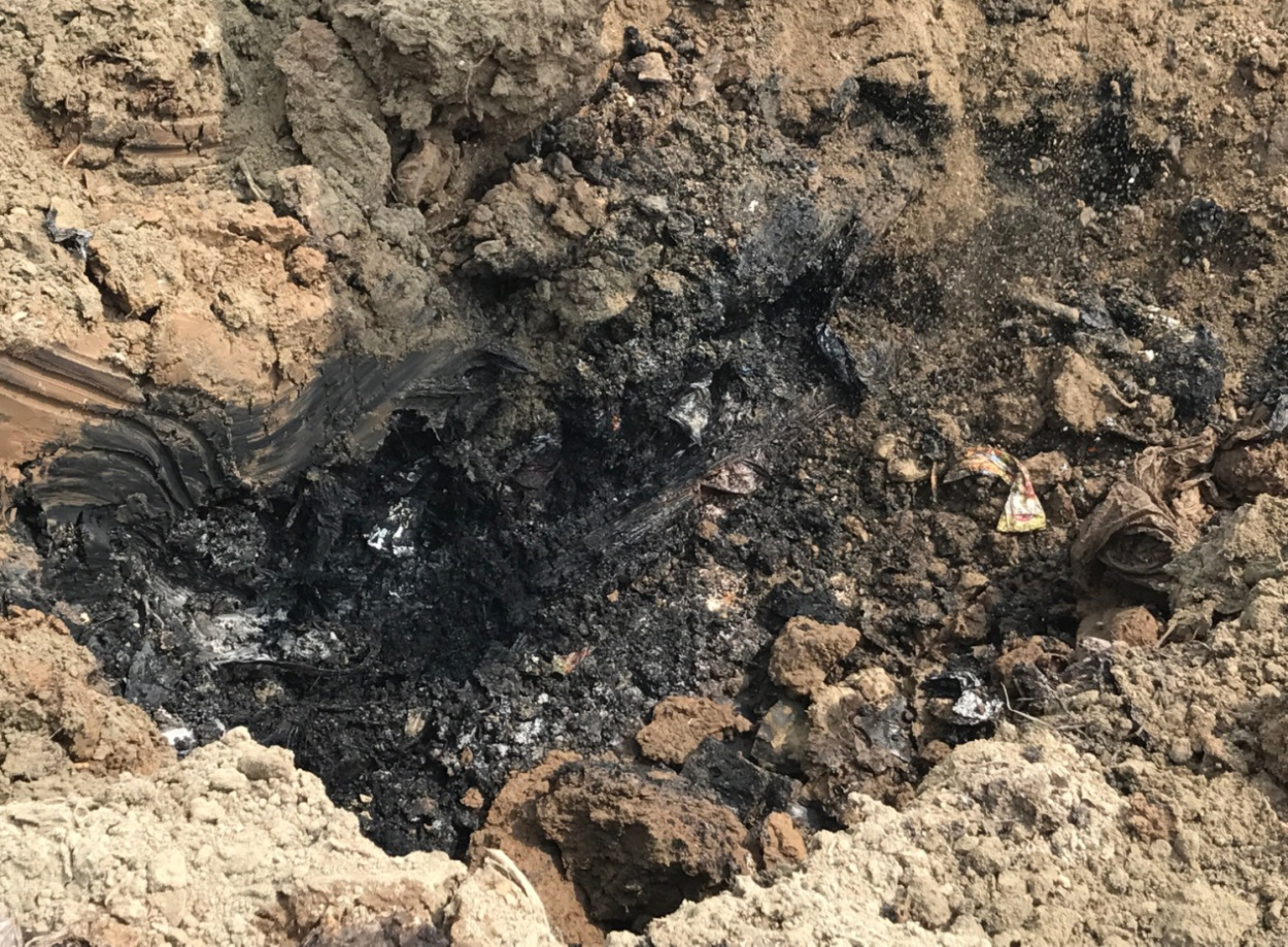 圖2 僅挖數(shù)鏟就現(xiàn)出黑色化工廢料,刺激性氣味強(qiáng)烈