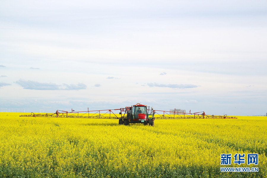 7月21日,一輛自走式噴藥機(jī)正在內(nèi)蒙古呼倫貝爾市謝爾塔拉農(nóng)場(chǎng)對(duì)油菜花進(jìn)行追肥作業(yè)。(新華網(wǎng) 汪亞/攝)