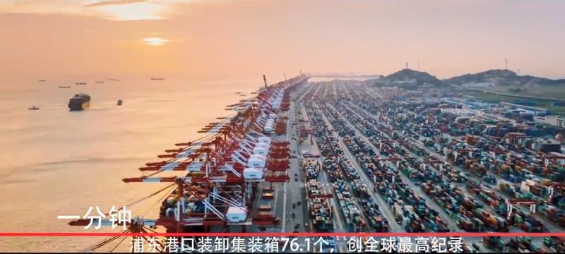 一分鐘,浦東港口裝卸集裝箱76.1個,全年集裝箱年吞吐量近4000萬標(biāo)箱,創(chuàng)全球港口集裝箱運輸史最高紀(jì)錄。