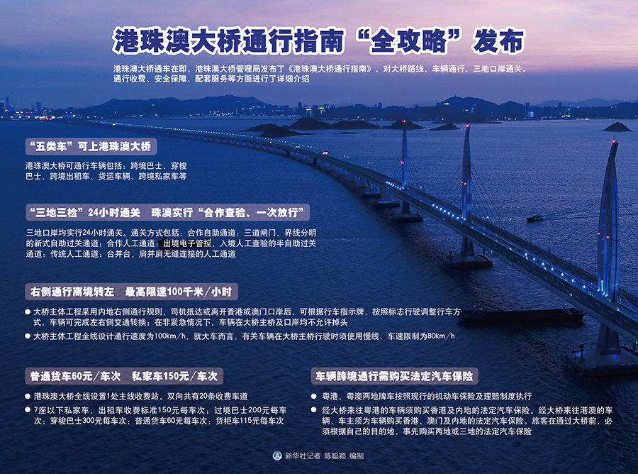 新華社廣州10月21日電(記者 周強)港珠澳大橋通車在即,港珠澳大橋管理局發(fā)布了《港珠澳大橋通行指南》,對大橋路線、車輛通行、三地口岸通關(guān)、通行收費、安全保障、配套服務(wù)等方面進行了詳細介紹。