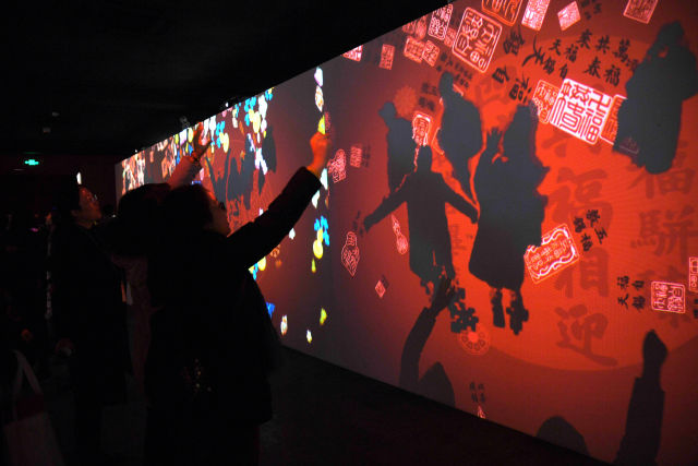 1月21日,人們體驗數(shù)字沉浸體驗展“納福迎祥”部分,張開手臂,收納從天而降的吉慶百福。