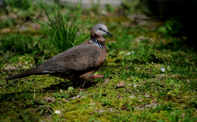 記者居住的小區(qū)里鳥也很多,陽臺下面一棵廣玉蘭樹上,一對珠頸斑鳩已經(jīng)安家了很多年。經(jīng)??匆姴弊由虾孟翊髦蝗φ渲轫?xiàng)鏈的珠頸斑鳩,結(jié)伴到小區(qū)草地上覓食,熟悉得好像小區(qū)里的老鄰居。
