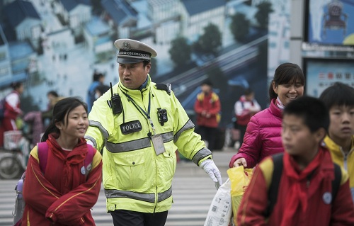 一位輔警在護(hù)送學(xué)生過馬路。陶明 攝