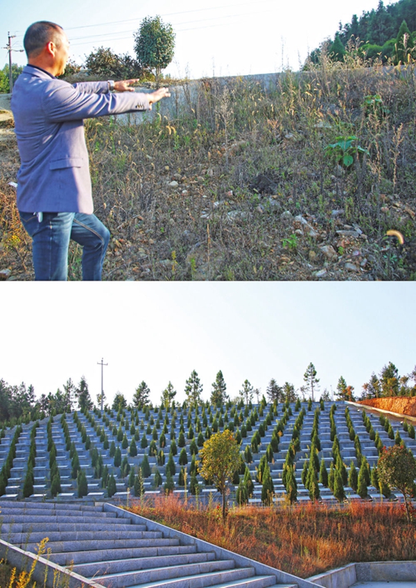 ▲拼版圖片:上圖為湖南平江縣梅仙鎮(zhèn)三里村支書(shū)王杏發(fā)在介紹已拆掉的活人墓;下圖為三里村新建公墓(11月15日攝)。新華每日電訊記者 謝銳佳 攝
