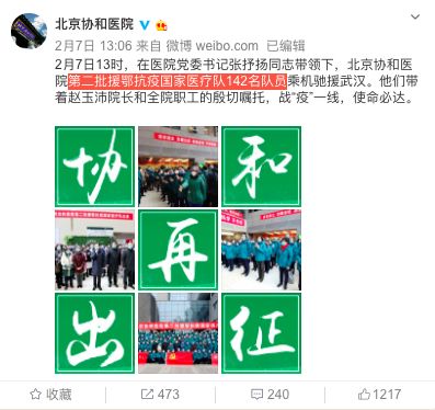 據(jù)悉,2月7日13時(shí),北京協(xié)和醫(yī)院第二批援鄂抗疫國(guó)家醫(yī)療隊(duì)142名隊(duì)員乘機(jī)馳援武漢。