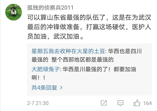 有網(wǎng)友表示,北協(xié)和、南湘雅、東齊魯、西華西,中國(guó)醫(yī)療界最頂尖的王炸帶上各省份的天團(tuán)會(huì)師武漢!今天看到最戳心的一句話是:全村的龍已把最硬的麟給你,哪怕自己也傷痕累累,所以,武漢,加油!