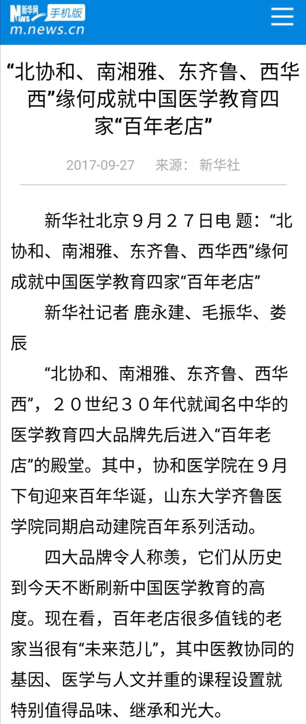 新華社有篇報(bào)道把它們稱為中國(guó)醫(yī)學(xué)教育四家“百年老店”,是20世紀(jì)30年代就聞名中華的醫(yī)學(xué)教育四大品牌。它們從歷史到今天不斷刷新中國(guó)醫(yī)學(xué)教育的高度?!?/p>