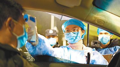 在廣西來賓市某高速公路出口,醫(yī)護(hù)人員為司機(jī)監(jiān)測體溫。高如金攝(人民視覺)