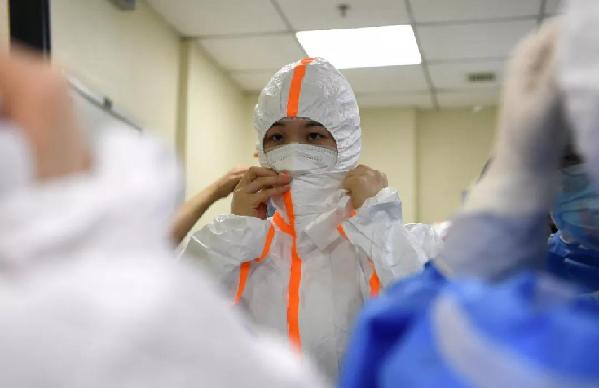 武漢協和醫(yī)院(西院),湘雅醫(yī)院感染病科醫(yī)生在穿防護衣。經濟日報記者高興貴攝