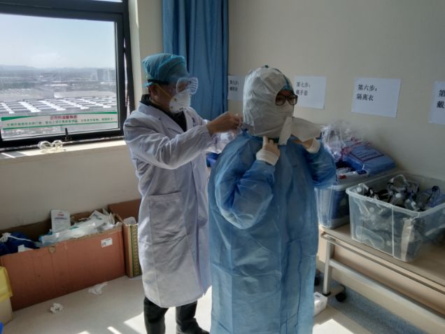 首先是防護裝備。進隔離病房一般是三級防護,除穿戴防護服、隔離衣、護目鏡、N95口罩、兩層手套,兩層腳套外,還要戴正壓防護頭套或一次性全面型防護頭套。此外,頭套還帶有新風過濾系統(tǒng)。整套防護裝備,凌肯在老師的幫助下,花了半個小時才穿上。穿戴完畢,凌肯整個人都很難受。護目鏡起霧,頭套風機發(fā)出巨大噪音,還有悶熱,整個人都變得遲鈍。