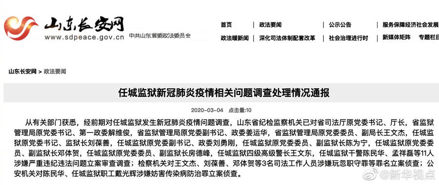 山東任城監(jiān)獄新冠肺炎疫情相關(guān)問題調(diào)查處理情況通報(bào)-新華網(wǎng)