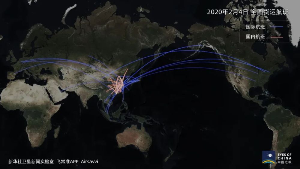1個(gè)月內(nèi),中國國內(nèi)和直飛世界各地的貨運(yùn)航班快速增多,原有航線航班數(shù)也有增加,標(biāo)示航線的橘色、藍(lán)色線條也就更粗。