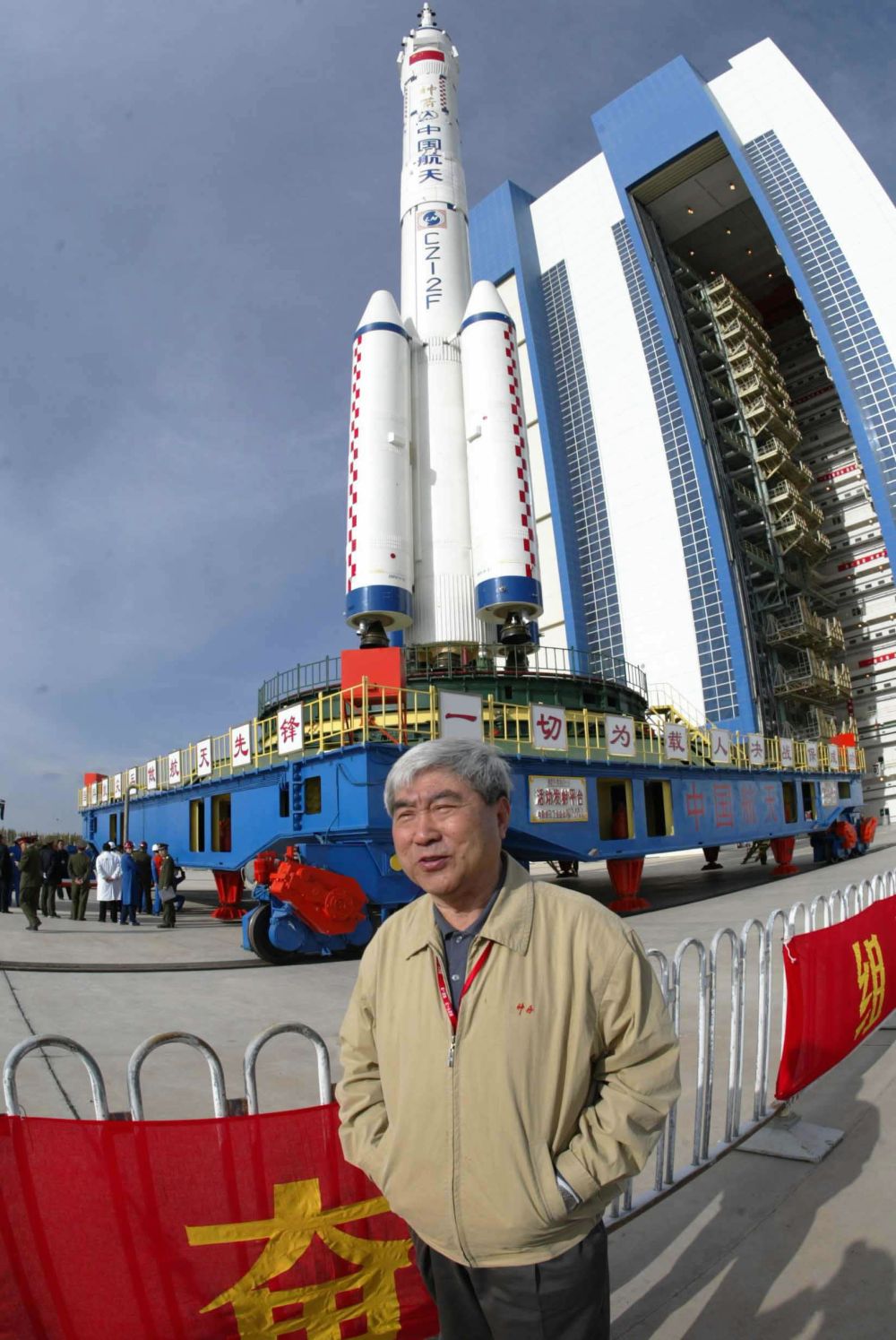 2003年10月16日,酒泉,戚發(fā)軔在“神舟”五號(hào)載人飛船前留影。新華社記者李剛攝