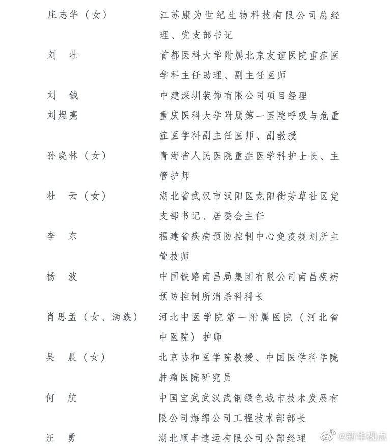 榮獲第24屆“中國青年五四獎?wù)隆钡姆謩e是:江蘇省南京市鼓樓區(qū)方家營消防救援站站長助理、三級消防長丁良浩,安徽省滁州市定遠(yuǎn)縣吳圩鎮(zhèn)西孔村黨總支第一書記王萌萌(女),廈門大學(xué)航空航天學(xué)院常務(wù)副院長、特聘教授、博士生導(dǎo)師尤延鋮,湖北省黃岡市羅田縣希望小學(xué)校長方榮(女),浙江每日互動網(wǎng)絡(luò)科技股份有限公司董事長兼總經(jīng)理、黨委書記方毅,浙江省杭州市拱墅區(qū)職業(yè)高級中學(xué)美發(fā)專業(yè)教師石丹(女),國家超級計(jì)算無錫中心副主任付昊桓,中國石油大港油田公司第二采油廠作業(yè)二區(qū)注采二組副組長馮萌萌(女),寧夏回族自治區(qū)石嘴山市中醫(yī)醫(yī)院副主任醫(yī)師朱斌,中國國家女子排球隊(duì)隊(duì)員、隊(duì)長朱婷(女),95072部隊(duì)參謀部訓(xùn)練處正團(tuán)職飛行技術(shù)檢查主任劉飛,廣西壯族自治區(qū)玉林市博白縣桂源農(nóng)牧有限公司總經(jīng)理劉入源,貴州省黔西南州望謨縣實(shí)驗(yàn)高中黨總支副書記、副校長劉秀祥,哈爾濱工業(yè)大學(xué)體育部副教授張虹(女),遼寧省沈陽造幣有限公司鉗工高級技師、維修班班長張文良(滿族),北京市朝陽區(qū)青少年指導(dǎo)服務(wù)中心主任張曉菲(女),吉林省超凡夢想公益基金會理事長張超凡(女),中國科學(xué)院計(jì)算技術(shù)研究所所長助理、研究員、博士生導(dǎo)師陳云霽,武警部隊(duì)某部特戰(zhàn)訓(xùn)練大隊(duì)代理大隊(duì)長陳玉浩,中山大學(xué)中山眼科中心副主任、研究員林浩添,四川省廣元市青川縣恒豐食用菌種植專業(yè)合作社理事長、青川海伶山珍商貿(mào)有限責(zé)任公司總經(jīng)理趙海伶(女),航空工業(yè)哈爾濱飛機(jī)工業(yè)集團(tuán)有限公司數(shù)控銑工秦世俊,92950部隊(duì)飛行一大隊(duì)大隊(duì)長袁偉,中鐵二局磨萬鐵路第Ⅵ標(biāo)項(xiàng)目經(jīng)理部第一分部二工區(qū)工區(qū)長、高級工程師徐州,博奧賽斯(天津)生物科技有限公司董事長欒大偉,港珠澳大橋管理局副總工程師、教授級高級工程師景強(qiáng),湖北省咸寧市崇陽縣白霓鎮(zhèn)大市村黨支部書記程桔(女),山東省七兵堂集團(tuán)股份有限公司董事長、黨支部書記謝清森,江蘇蘇寧物流有限公司快遞員潘虎,南京大學(xué)醫(yī)學(xué)院附屬鼓樓醫(yī)院腫瘤科行政副主任、南京大學(xué)臨床腫瘤學(xué)研究所副所長、博士生導(dǎo)師魏嘉(女),中國醫(yī)科大學(xué)附屬第一醫(yī)院重癥醫(yī)學(xué)科黨支部書記、副主任,教授、主任醫(yī)師丁仁彧,內(nèi)蒙古自治區(qū)第四醫(yī)院護(hù)士長、副主任護(hù)師王穎麗(女、蒙古族),四川省醫(yī)學(xué)科學(xué)院·四川省人民醫(yī)院EICU副主任醫(yī)師鄧?yán)冢憬『贾菔兄嗅t(yī)院重癥監(jiān)護(hù)室副護(hù)士長朱佳清(女),江蘇康為世紀(jì)生物科技有限公司總經(jīng)理、黨支部書記莊志華(女),首都醫(yī)科大學(xué)附屬北京友誼醫(yī)院重癥醫(yī)學(xué)科主任助理、副主任醫(yī)師劉壯,中建深圳裝飾有限公司項(xiàng)目經(jīng)理劉鋮,重慶醫(yī)科大學(xué)附屬第一醫(yī)院呼吸與危重癥醫(yī)學(xué)科副主任醫(yī)師、副教授劉煜亮,青海省人民醫(yī)院重癥醫(yī)學(xué)科護(hù)士長、主管護(hù)師孫曉林(女),湖北省武漢市漢陽區(qū)龍陽街芳草社區(qū)黨支部書記、居委會主任杜云(女),福建省疾病預(yù)防控制中心免疫規(guī)劃所主管技師李東,中國鐵路南昌局集團(tuán)有限公司南昌疾病預(yù)防控制所消殺科科長楊波,河北中醫(yī)學(xué)院第一附屬醫(yī)院(河北省中醫(yī)院)護(hù)師肖思孟(女、滿族),北京協(xié)和醫(yī)學(xué)院教授、中國醫(yī)學(xué)科學(xué)院腫瘤醫(yī)院研究員吳晨(女),中國寶武武漢武鋼綠色城市技術(shù)發(fā)展有限公司海綿公司工程技術(shù)部部長何航,湖北順豐速運(yùn)有限公司分部經(jīng)理汪勇,天津醫(yī)科大學(xué)總醫(yī)院呼吸與危重癥醫(yī)學(xué)科監(jiān)護(hù)室護(hù)士長沈悅好(女),西安交通大學(xué)第二附屬醫(yī)院急診科副主任、副主任醫(yī)師張正良,青島大學(xué)附屬醫(yī)院麻醉科主治醫(yī)師張孝田,湖南省湘潭市第一人民醫(yī)院重癥醫(yī)學(xué)科主任、副主任醫(yī)師易釗泉,湖南省懷化市志愿者協(xié)會副秘書長羅小小,華中科技大學(xué)同濟(jì)醫(yī)學(xué)院附屬同濟(jì)醫(yī)院心內(nèi)科副教授、副主任醫(yī)師周寧,甘肅藍(lán)天救援隊(duì)理事長、隊(duì)長於若飛,武漢大學(xué)中南醫(yī)院感染科護(hù)士長、主管護(hù)師胡慧(女),遼寧省沈陽橡膠研究設(shè)計(jì)院有限公司研發(fā)中心基礎(chǔ)理論與材料研究主任工程師姚秀超,山西醫(yī)科大學(xué)第一醫(yī)院神經(jīng)內(nèi)科護(hù)士長、主管護(hù)師唐珊(女),湖北省武漢市公安局江漢區(qū)分局警務(wù)指揮處民警涂可藹(土家族),廣州醫(yī)科大學(xué)附屬第一醫(yī)院重癥醫(yī)學(xué)科副主任醫(yī)師桑嶺,湖北省武漢市第三醫(yī)院重癥醫(yī)學(xué)科副主任醫(yī)師董芳(女),東南大學(xué)附屬中大醫(yī)院重癥醫(yī)學(xué)科主任醫(yī)師潘純。